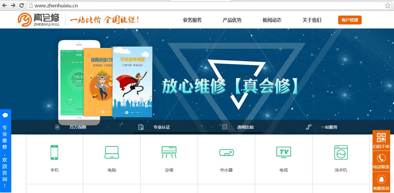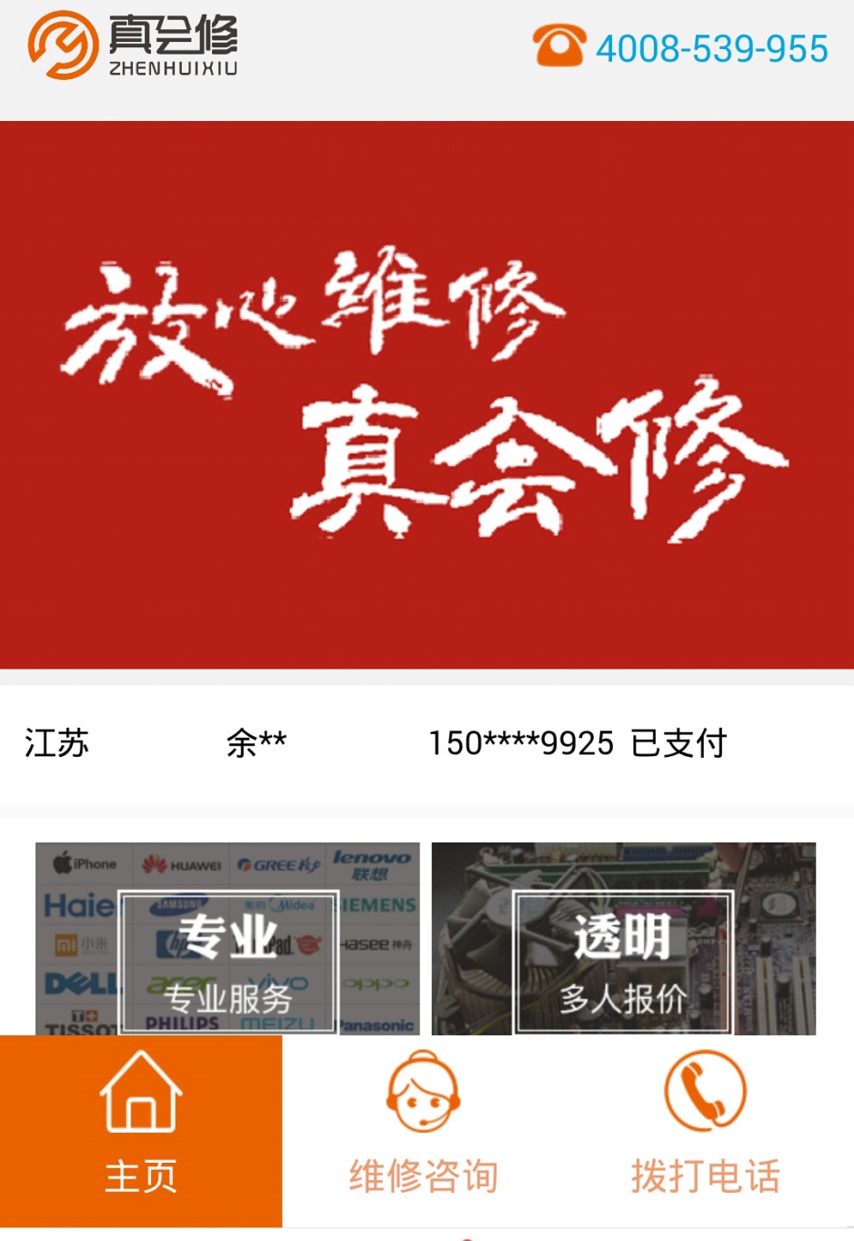 三、百万维保,维修服务更放心 真会修准备了100万元维修保障金,针对在平台下单维修过的用户,如果一年内因非人为原因造成的售后问题,在由平台审核确认之后,由平台赔付给用户,超长的质保让用户无后顾之忧。 四、品类齐全,想修的这都可以修 真会修目前开通了手机、电脑、空调、热水器、电视、洗衣机等十余种品类的维修功能,满足用户多方面多层次的维修需求,平台还在细化和完善可维修的品类,后期会给用户更好的呈现和选择。 五、多渠道下单,总有一种方便你 用户在真会修上可通过多种方式进行下单,关注微信公众号“真会修”,拨打客服电话4008-539-955,或者通过电脑或手机的浏览器找到官网(www.zhenhuixiu.cn),都可以下订单维修。