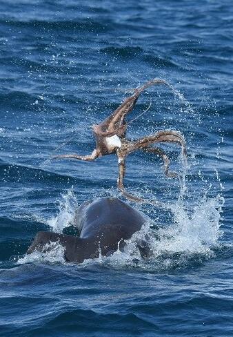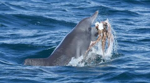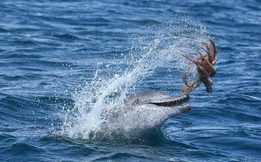 海豚完全将章鱼含在嘴里,随后又将其抛入空中(网页截图) 克丽丝塔表示,她以前也见过海豚跟章鱼嬉戏,不过能及时将画面抓拍下来还是很难得,因为海豚跟章鱼嬉戏并不常见。她表示,还没有见过当地海豚最后吃掉章鱼的情况,海豚真的只是在跟章鱼“玩耍”。 |