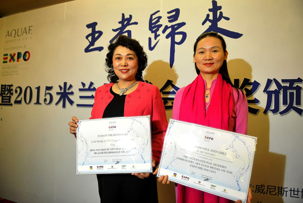 榕宸健康科技有限公司董事长刘婕(左) 、刺绣艺术大师朱寿珍获得金奖殊荣