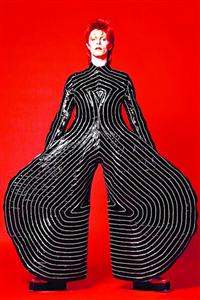 1973年,大卫·鲍伊身着山本宽斋为他的“阿拉伯神灯”巡演设计的“东京波普”风格条纹连体衣。