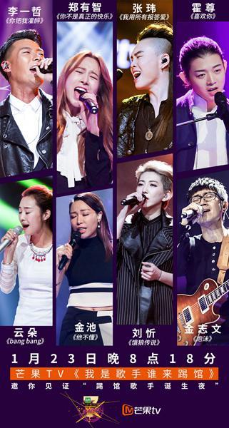 1月23日,芒果TV《我是歌手谁来踢馆》将迎来最后的终极决战——踢馆歌手诞生夜,终极踢馆八强李一哲、郑有智、张玮、霍尊、云朵、金池、刘忻、金志文将通过分贝值争夺《我是歌手4》的唯一的终极踢馆歌手名额。八位歌手将现场翻唱邓紫棋、张靓颖等歌手在前三季《我是歌手》献唱的经典曲目,他们将如何改编和演绎网友们都耳熟能详的歌曲,成为终极踢馆夜一大亮点和看点。 据悉,在《歌手踢馆》的踢馆歌手诞生夜,八强每人都将拥有演唱两首歌的机会,其中一首为自选歌曲,另一首则歌手在踢馆冲刺中的直播现场抽取的歌曲,这些歌曲是前三季《我是歌手》中最受网友喜爱的八首曲目。 邓紫棋、张靓颖、张杰等历届《歌手》竞演选手演唱的曲目上榜最多,其中唱作俱佳的金志文将演唱邓紫棋的《泡沫》,而张玮则抽签抽中了张靓颖的《我用所有报答爱》,邓紫棋在《歌手2》中表演的《你把我灌醉》、《喜欢你》将分别由R&B小王子李一哲和天韵之音霍尊演唱。民族靓嗓云朵则将演唱碧昂丝的《bangbang》,唱跳俱佳的韩国偶像郑有智将带来中文歌曲《你不是真正的快乐》,刘忻将在直播中首次挑战粤语歌曲《饿狼传说》,醇厚女音金池将演唱张杰的经典歌曲《他不懂》。 自选歌曲可以突显八强个人优势,而抽签确定的歌曲,则更多像是芒果TV给八强歌手的“命题作文”,给定的歌曲可能与歌手本身的气质不符,与歌手平时的曲风不符,但歌手必须通过现场演唱的方式来交答卷、得高分,这就要考验歌手的改编、创作、制作能力以及现场表现力。如以民族曲风和高音见长的云朵,将演唱碧昂丝火辣劲爆动感的《bangbang》,她将如何演绎,能否超越张靓颖的改编;而擅长中国风音乐的霍尊则要带来《喜欢你》这样的摇滚歌曲,他将对歌曲进行古风改编还是突破自我展现摇滚范,网友们都非常期待。