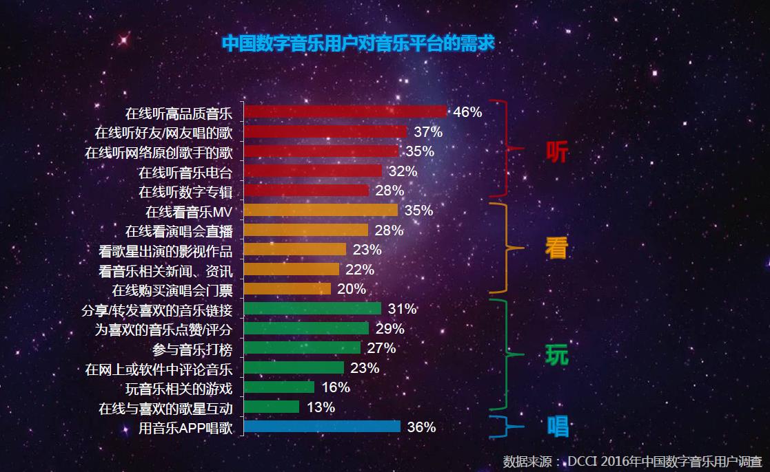 付费需要更强的内容驱动力。对于目前数字音乐市场的布局,DCCI报告提出了音乐IP向明星IP转变的观点。报告特别指出:QQ音乐推出“MUSIC+”巨星定制计划,该计划包括版权-产品-互动-内容-活动-商业等全景生态,将用开放化的音乐大社区连接内容、用户、终端等各音乐产业环节,提供更多智能化及个性化服务,唤醒全产业的数字化变革。类似的还有意在打通音乐产业上下游的阿里星球(原天天动听),此举也能有效将音乐核心资源掌握在自己手中。 玩法:构建听、看、玩、唱的综合生态体系 由音频播放上升到社会化互动,是当前中国数字音乐用户必须进行的玩法升级。具体来说,用户需要的不仅仅是单纯的音乐收听,而是以音乐作为互联网生活的入口,听、看、玩、唱已经成为他们对于数字音乐平台的四大需求。