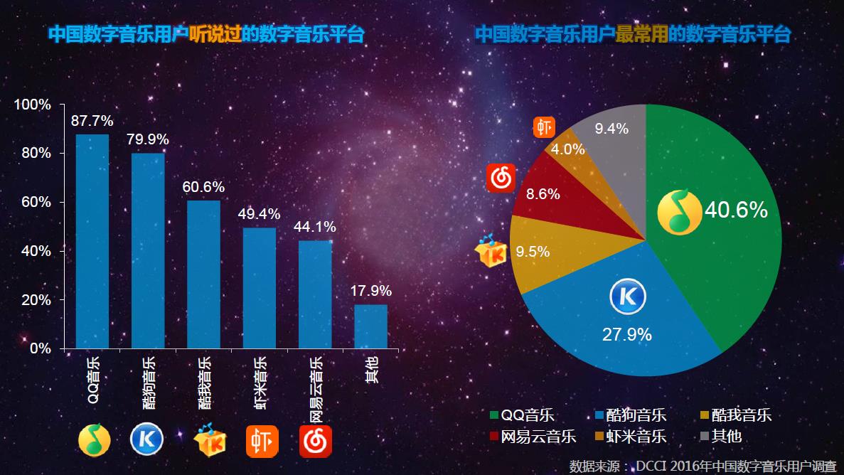 DCCI 互联网数据中心《2016年中国数字音乐平台发展研究报告》最近正式出炉,针对中国数字音乐平台发展现状、数字音乐用户行为习惯进行了深度洞察。报告指出:中国数字音乐用户最常用的数字音乐平台为QQ音乐、酷狗音乐和酷我音乐,使用比例分别为:40.6%、27.9%和9.5%。