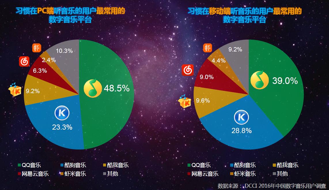 不仅如此,QQ音乐所开辟的数字专辑,Music+等创新商业模式也正在展现威力。据了解,自2014年QQ音乐携手周杰伦推出华语乐坛首张数字音乐专辑并创下“白金级”数字销量以来,包括张杰、李宇春、鹿晗、周笔畅、林俊杰、BIGBANG、Adele、Rihanna在内的众多海内外乐坛巨星也相继通过QQ音乐发行数字专辑、累计销量直逼2000万张。拥有王力宏、TFBOYS、李宇春等超人气巨星加盟的“MUSIC+”计划也在不断实现音乐产业链的深化联动,通过独家首发、数字专辑发行、专属音乐会、专属粉丝部落、演出活动等全方位定制化服务最大化的实现明星IP价值,实现乐迷聚拢。 在QQ音乐上,不仅有针对乐迷视听习惯提供的数字专辑,让高品质的音乐触手可得,丰富的衍生化运营也让乐迷有了更多接触到明星的机会。对于用户而言,“好听”、“好玩”的QQ音乐已从单纯的听歌工具中跳出,成为数字生活的“新常态”。因此,不论是PC端还是移动端,QQ音乐也都以48.5%及39%的占比牢牢把握住了用户使用的第一位。
