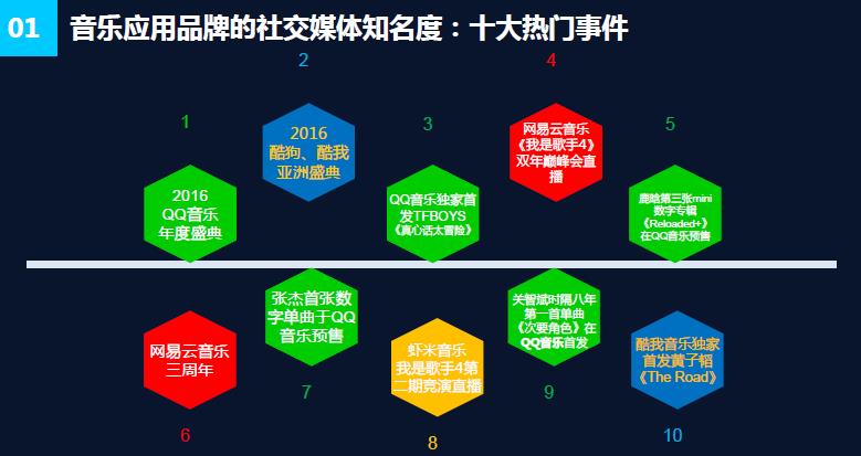 正版化红利令数字音乐迈入快速发展期,并在人们的社交媒体生活中扮演着越来越重要的角色。近日,著名社媒调研机构知微数据发布《音乐应用品牌社交媒体表现数据分析》,并公布了音乐应用品牌在微博的10大热门事件。可以看到,音乐盛典、数字专辑、音乐综艺相关话题所获得的关注度最高,其中,由QQ音乐所创造的热门事件多达一半,其他热门事件集中在网易云音乐、酷狗和虾米,据此也侧面反映出了各音乐平台在社交媒体的知名度。