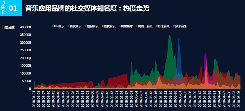 从具体的热度数据来看:近半年来,QQ音乐凭借近800万次的微博提及总量,领先于其他音乐应用,并在3月25日巅峰盛典达到35万的总峰值。3月29日的酷音乐亚洲盛典,给酷狗音乐带来了单日约33万的提及数。4月16日,凭借《我是歌手4》热播,网易云音乐、虾米音乐、天天动听走势相似,也攀上了热度峰值。 |
