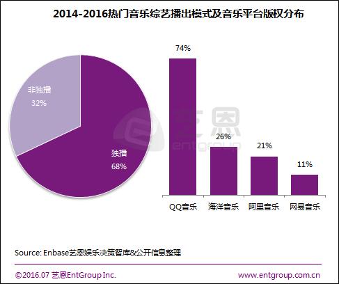 艺恩统计发现,相较于非独播,独播模式显然更受到平台方的欢迎,近三年基本上占到近七成。而在这些热门音乐综艺版权覆盖上,QQ音乐在所有音乐平台中以74%的覆盖率位居榜首,领先优势十分显著,此外,海洋音乐和阿里音乐覆盖率也双双达到了20%。而通过与优质在线音乐平台的合作尤其是独家合作,不仅热门音乐综艺能获得超越预期的收听效果、提升节目价值,音乐平台也能借此增强用户粘性、提升品牌辨识度。如去年,QQ音乐凭借现象级综艺《中国好声音4》的独播,就创下了80亿次总在线试听,今年独播的《跨界歌王》,专题页面浏览人数已破2200万,总播放量也达到了1700万次;网易云音乐凭借《我是歌手4》,单场比赛的热门单曲评论数基本都有6000-7000多条,大大高于日常的平均值。 曲库利剑平天下 明星IP时代同步到来 去年国家版权局出台下架禁令后,各大音乐平台纷纷转向版权购买,因而唱片公司成为了大家争抢的香饽饽。具体来看,QQ音乐的黄金资源最多,在1500万首的版权曲库中,共与国内外超过200家唱片公司达成战略合作,其中30余家为独家版权:包括国际三大唱片公司中华纳、索尼,网罗众多韩流巨星的YG娱乐、LOEN、CUBE等;网易云音乐亦跟CJ等韩国公司达成合作,同时也分享了包括种子等在内的华语版权;阿里音乐拥有滚石、华研、寰亚、BMG等公司的版权,而海洋音乐则携手了极韵文化等多家版权方。