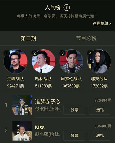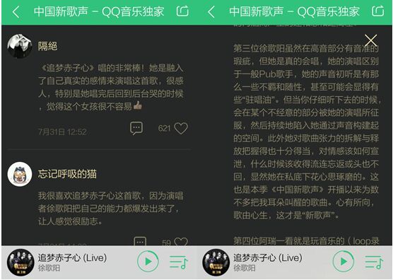 除了获得大众与专业人士的双重肯定,徐歌阳的《追梦赤子心》在全民K歌“中国新歌声翻唱大赛”上也成为了热门K歌金曲。在丰富的综艺运营经验下,QQ音乐今年充分挖掘了《中国新歌声》的创意玩法,除了与节目实时同步的“零时差专辑”以及可挥洒心情的点评区之外,“投票+送礼”的创新互动方式让乐迷也能更直接的对学员表达爱意,而利用大平台优势与全民K歌的联动,更是让乐迷们过足“麦霸”瘾,让节目的参与感更加立体。