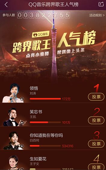 经过数月的激烈角逐,备受瞩目的首档大型明星跨界音乐节目《跨界歌王》将于本周六进行半决赛第二场的比拼。作为《跨界歌王》的独家播放平台,QQ音乐也倾力助阵,与其携手展开了“点亮小蛮腰 帮偶像上头条”的歌手人气投票活动。目前,投票结果已正式揭晓,刘涛以近200万的高票将于今晚正式“登上”广州塔。而通过这种线上线下的创意联合,QQ音乐也帮助粉丝传递了对跨界歌手们的喜爱,并将实现史上最美表白!