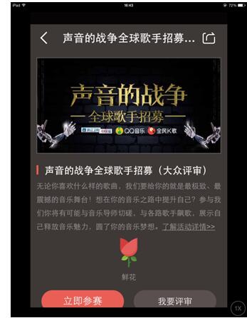 就在导师们倾注心血打造极致音乐盛宴的同时,《声音的战争》音频独播平台QQ音乐也正在紧锣密鼓的展开“声音的战争全球歌手招募”活动。打破网综合作传统,QQ音乐这次除了继续提供王牌功能“零时差专辑”和强大的DTS音效实时“还原”现场之外,还通过全民K歌为热爱歌唱的乐迷们提供了一个直通现场、展示才华的平台:只要有一把好嗓子,就有机会通过全民K歌进行“踢馆”、在现场与大咖音乐导师和各路歌手飙歌比拼,一圆音乐梦想!