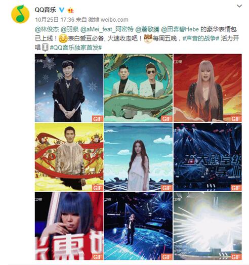 作为本年度压轴登场的重磅音乐节目,由浙江卫视原创打造的《声音的战争》已正式进入倒数!随着“战争”即将打响,节目独家音频合作平台QQ音乐也放出了Music Knight林俊杰、Vocal女王张惠妹、Rock Star萧敬腾、Live精灵田馥甄和Pop双子星羽泉组合五大殿堂级导师的豪华表情包,引得一众迷弟迷妹争相表白。而作为数字音乐界的“综艺航母”,QQ音乐也首次参与节目制作,携旗下人气K歌平台全民K歌展开了线上素人歌手选拔,为激烈的战场储备民间战斗力量!
