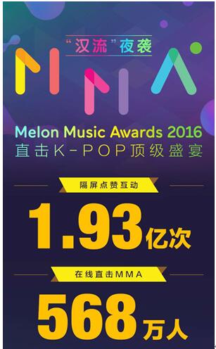 本届MMA以“音乐·魔法一般的舞台”为主题,从舞台设计到明星演出阵容都堪称“大手笔”。当晚,代表韩国歌谣界最高荣誉的“年度专辑”、“年度歌曲”、“年度艺人”分别由防弹少年团、Twice和EXO摘得,水晶男孩时隔16年的惊喜合体,更让在座后辈偶像感动飙泪。在与MMA的深度合作之下,QQ音乐通过红毯的群星直击、现场的颁奖演出、后台的巨星探秘,为中国观众打造了一场跨越空间的零距离“群星见面会”,颁奖嘉宾也多次隔空向QQ音乐的观众打招呼问好。据统计,共计568万中国乐迷通过手机、PAD、电脑在QQ音乐同时见证了这场近7个小时的音乐狂欢,并为偶像们送出了1.93亿次的点赞和1100万星币的礼物。