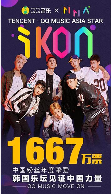 作为MMA2016的新增重磅大奖,首次由海外数字音乐平台腾讯QQ音乐票选出的“Tencent·QQ Music Asia Star”见证了获奖人iKON的亚洲超人气。首次参评韩国顶级颁奖礼,中国粉丝在票选活动之初就表现出了强大的应援力,最终以1667万的高票令iKON杀出重围,活动整体投票数更逼近3000万。对于来自海外粉丝的肯定,iKON现场激动致谢,在随后的后台采访直播环节,也心情大好与QQ音乐直播观众隔空玩起游戏,火速吸引了30万用户同时在线围观,对于一路支持的粉丝,一向亲民的7位成员还贴心录制了一段起床铃,令IKONIC们幸福感爆棚。