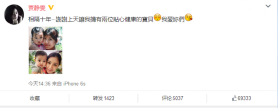 贾静雯微博截图 人民网北京1月29日电 (艾雯) 昨天,贾静雯微博上传十年前后对比照并配文:“相隔十年 谢谢上天让我拥有两位贴心健康的宝贝我爱你们”。第一张是贾静雯怀抱十年前的大女儿梧桐妹,另一张则是贾静雯抱着小女儿咘咘的近照。两个宝贝意外撞脸,都遗传了妈妈乌黑圆溜溜的大眼睛。网友直呼:“太像了!”十年前后的贾静雯反而原来越来越美,再度收获爱情的她为广大女粉丝诠释了什么是“自立的女人最美丽。”