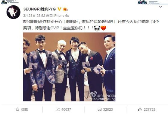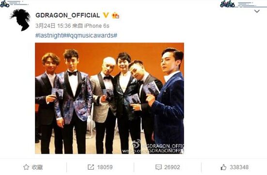 当晚BIGBANG组合相续拿下 “最受欢迎海外组合”、“年度畅销数字专辑”、“年度最佳音乐录影带”三项大奖,人气成员权志龙(G-Dragon)更拿下了 “年度最具影响力男歌手”的个人奖项。从奖项上看也足以看到BIGBANG如今在国内乐坛的重要地位。 当晚,BIGBAND成员们也通过微博感谢了QQ音乐和粉丝们的支持;更在盛典后台与郎朗亲密互动,俨然变成密友。