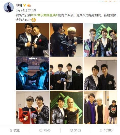 盛典结束后,郎朗也在微博上发表微博,感谢QQ音乐和粉丝,并附带当晚在后台与众多明星的合影。