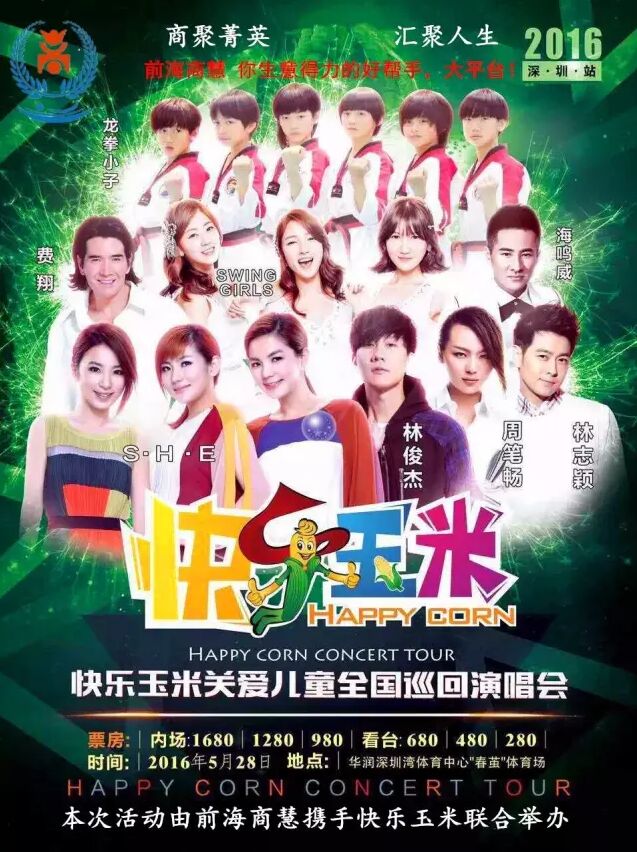深圳站演唱会简介: A brief introduction to the concert ▶主题:前海商慧携手快乐玉米关爱儿童全国巡回演唱会-深圳站 ▶艺人:SHE / 林志颖 / 周笔畅 / 林俊杰 / 费翔 /海鸣威 / swing girls / 龙拳小子 ▶时间:2016年5月28日(星期六下午17:00入场 19:30准时开始) ▶地点:深圳湾体育中心(春茧体育中心) ▶票房:VIP1680 / 1280 / 980 / 680 / 480 / 280 主办单位:深圳前海商慧携手快乐玉米联合主办 ▼演唱会主题海报