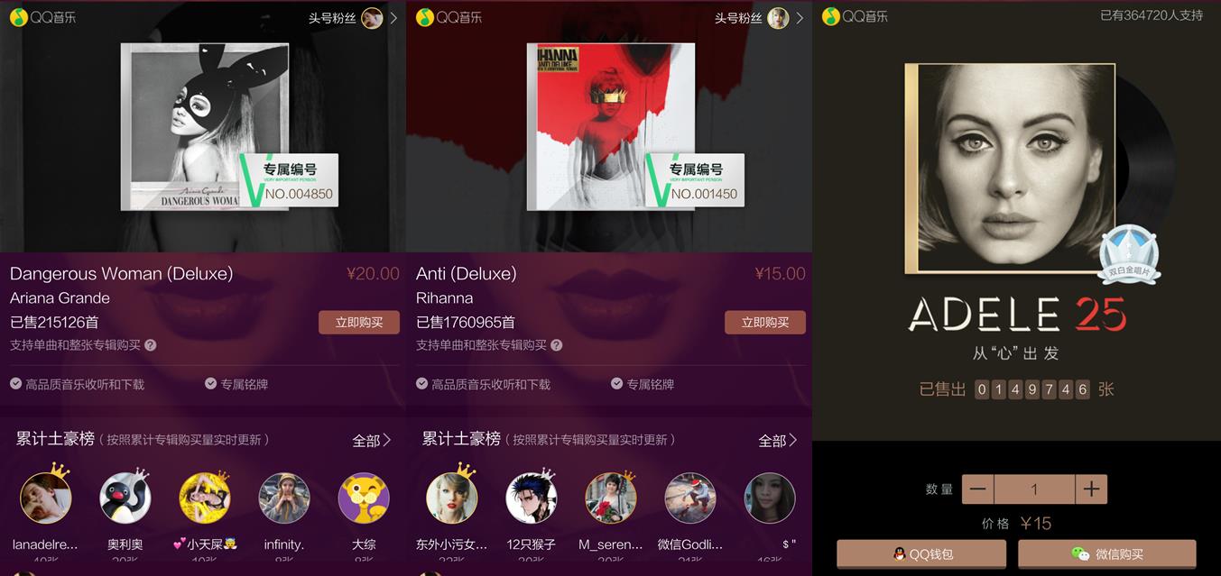 2015年,随着QQ音乐首创的数字专辑模式大获成功,中国数字音乐“付费”已成为一大趋势,截至目前,QQ音乐数字专辑的整体销量已突破1500万张,而欧美歌手的音乐作品在告别了发行上的时间差之后,在中国市场也逐渐消除了“水土不服”。就在A妹之前,Adele的《25》在QQ音乐已经创下近15万张的双白金销量、Rihanna的《Anti》也售出了超过170万首单曲,欧美音乐在中国市场的已经爆发出了惊人潜力,而QQ音乐也已成为欧美巨星入华、引爆内地市场的第一站。 |
