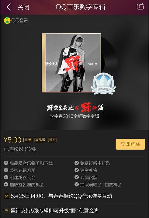 春春空降所在的歌曲《存在感》更是李宇春两年磨一剑的最新重磅音乐作品,所属专辑《野蛮生长》还未发行就早已引发了万众期待。这一次,李宇春除了在曲风上更加大胆张扬之外,在发行方式上也颠覆以往,进行了数字化革新——不仅首次尝试数字专辑模式,还将专辑以《野》、《蛮》、《生》、《长》四张EP独立成章,从5月25日一直到10月,依次在QQ音乐独家发行。新EP《野》一经发售,更是就狂破纪录,以58秒突破金唱片等级!1分36秒突破双金唱片等级!2分36秒突破三金唱片等级!4分28秒突破白金唱片的速度,“野蛮”刷新一众记录!目前专辑销售量已破60万张,创造了五小时三白金的新纪录。 对于《野蛮生长》的新创意与好成绩,不仅是李宇春实力与人气的再见证,同时也是其在3月加入QQ音乐“MUSIC+”计划后,与QQ音乐合作爆发的一次“小宇宙”。从“情书”炸屏到破纪录销量,李宇春在“MUSIC+”的协作下进一步展现了自身的音乐价值。而在《野》之后,李宇春和QQ音乐还会怎样来“玩音乐”,想必也已激起了广大玉米们的新一轮猜想。 |