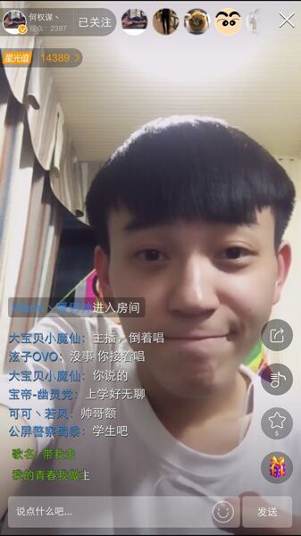 5月29日晚7点,繁星直播歌手,素有“国民弟弟”之称的何权谋现身手机直播举办“移动歌友会”,与粉丝见面互动,虽然当晚唱的歌不多,但他大谈家庭、学校趣事,风趣幽默的谈吐令现场粉丝捧腹大笑,都给他大大的“赞”。 众所周知,95后“国民弟弟”何权谋,因湖南卫视《变形计》而为大家所熟知,2015年入驻繁星直播更是凭借清澈声线和率真个性圈粉无数。当晚6点半左右,很多粉丝已经打开繁星直播,进入何权谋的手机直播间等候“国民弟弟”的来临。令粉丝们惊喜的是,没到7点,“国民弟弟”就开始直播了。他热情地跟粉丝们打招呼,大家都大赞其“太帅了!”“小帅锅”“小鲜肉”!有粉丝问他是不是每天都播,他表示自己还在上高中,课程比较紧张,只能在放假的时间直播。也有粉丝问他为什么不用电脑直播,他解释说,繁星手机直播随时随地的,十分方便。