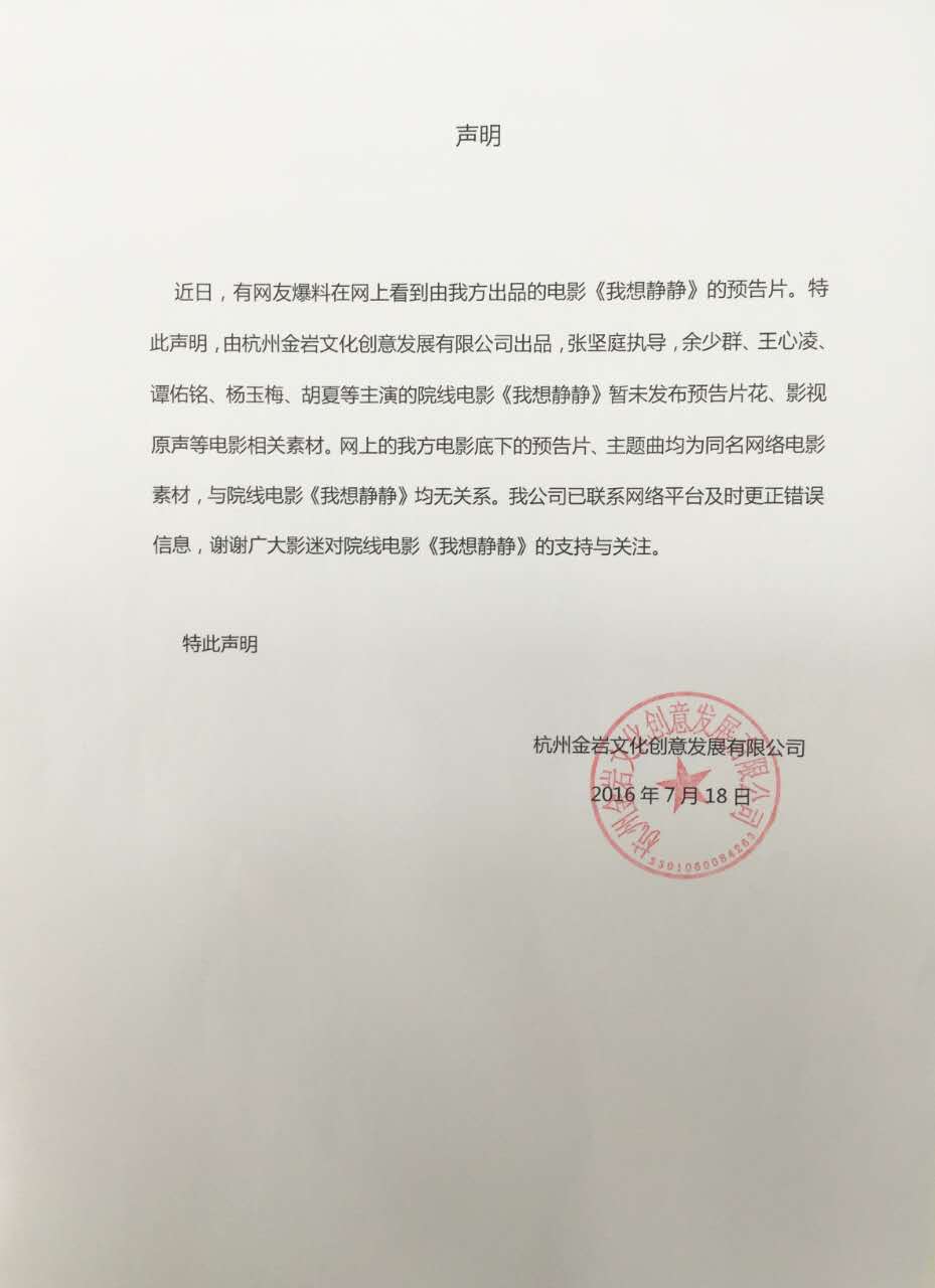 笔者上网一查才知道原来两部电影都叫《我想静静》,只不过一部是由杭州金岩文化创意发展有限公司出品的院线电影,另一部则是网络电影,所以有不少粉丝上网搜索想要一睹预告片,却发现许多视频网站的预告片链接都是另外一部片子,为了防止粉丝们混肴,院线电影《我想静静》出品方特地为此发了一篇声明。 据笔者了解,这部名叫《我想静静》的院线电影迄今为止还未发布任何视频预告,所以心急的粉丝可能还要再耐心等一等了。