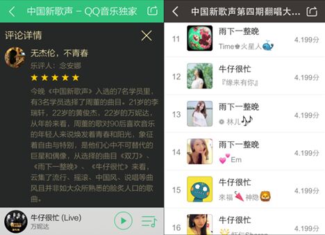 在比赛现场,李瑞轩、万妮达和黄俊杰分别以《双刀》、《牛仔很忙》、《雨下一整晚》带领观众追忆了周董三个不同的音乐阶段。而在学员歌曲同步上架QQ音乐“零时差专辑”后,不仅火速吸引了大批网友前来试听、讨论,周董原唱歌曲的试听量也迎来了一波高潮。不仅如此,QQ音乐大平台联动全民K歌举办的“中国新歌声翻唱大赛”也掀起了向周杰伦致敬的热潮,同样被这几首歌曲刷屏。