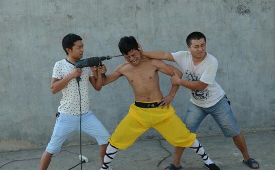 电钻钻脑袋 一把高速旋转的电钻,对着自己的脑袋直插下去,10几秒过后,没有看到鲜血直流,而只是钻破了表皮。看得人心惊肉跳。 表演绝技的叫赵锐,今年25岁,身高大概175公分,留着平头。看起来很普通,并不像什么武林高手,但是他在当地却小有名气。因为大家都看过他的金钟罩铁布衫表演。
