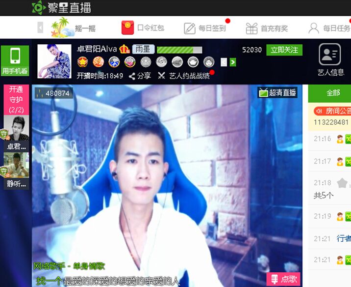 卓君阳以银灰色发型、一袭白衣潮帅亮相,瞬间引爆直播间。唱完代表作《我不是富二代》后他豪气宣布“我要做富一代”令粉丝大叫“好赞”!有粉丝迫不及待点新歌《你说》,歌声用快节奏Rap风唱出了所有分手的伤痛,令人叹息同时更加坚定爱情,极富特质的青春风格阳光嗓音则唱出了对爱的渴望和期盼。另一新歌《火辣辣》则以快节奏的风格唱出不同生活状态中的自己,令歌迷大呼过瘾。 作为90后的君阳GG,还有更多拿手绝活!要知道他还曾是中国音乐达人秀全国10强、腾讯星光大典内地年度男歌手,如今繁星直播历练半年,可不单单是只会唱原创!当晚翻唱十多首知名歌曲都是信手拈来情真意切,风格自然真诚,亲和力强,网友刷玫瑰花、吉普车、兰博基尼不断!唱《偶像万万岁》更是有粉丝送上1314幸运百合,人气一直居高不下。