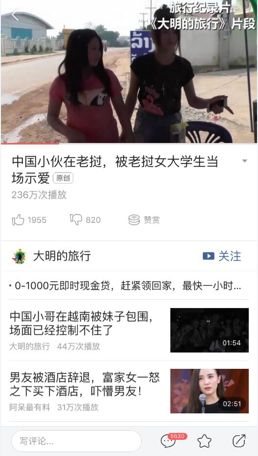 随着年初 papi 酱吹响号角,短视频创作者大军正在这个时代斗志昂扬地行进着。然而,他们很快发现,流量的高地并不那么容易被攻下:头部 IP 内容已经吸走了流量的大头,新入场的作者施展空间天然狭窄。 某种程度上来讲,这对新作者并不公平。 倒是新进入短视频领域的今日头条,呈现出了不一样的局面:机器算法不关心作者的名气和资历,只根据内容质量的优劣进行扩大推荐,这就使得所有作者其实处在同一条起跑线上。实际来看,也的确有很多新作者在头条号快速冒出,流量不输给资深大号。 以旅游类视频为例,传统视频网站旅游频道的首页位置一定是由知名旅行大咖、达人占据,新人原创内容生存土壤可谓十分贫瘠;但在头条号上,不少新人蹿红速度却很惊人。 “大明的旅行”就是这样一个例子,来自湖北的青年大明,用摄影机记录下了他在东南亚行走的点点滴滴。没有明星达人,每条视频里只有他和几位当地人,这样的“草根”内容放上传统视频网站可能会被迅速淹没。然而,大明发布的前几条视频播放量便迅速破万,很快又突破了 10 万大关。 这条在老挝拍摄的 2 分钟视频,在头条号上发布三天,居然收获了 236 万的播放量。该条视频的走红也使其登上了新榜头条视频榜的新贵榜。