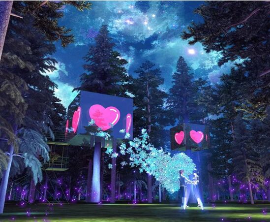 ▲会发光的音响?并不是!这是一个重力互动装置,叫“空谷回音”,这个装置可以模拟我们在山谷里的回音,啊~啊~啊~你朝小喇叭说一句话,整个森林都将听到你的声音。 随着蝴蝶的踪影,寻到这林间深处的一座小屋。 梦幻镜面像钻石一样在夜中闪闪发光,象征了爱情的忠贞此生不渝。