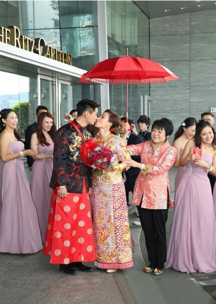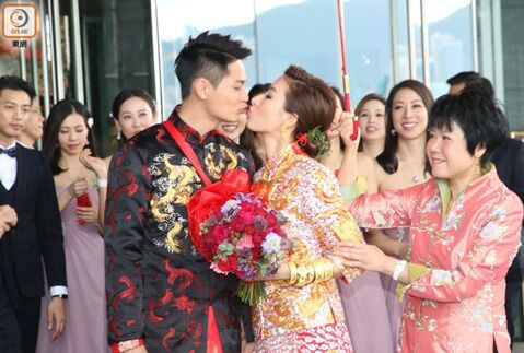 据香港媒体报道,杨怡与罗仲谦今日举行婚礼,从2011年11月恋情曝光到今天在Ritz-Carlton摆婚宴,五年姐弟恋终于尘埃落定。杨怡心情紧张,昨日发布与罗仲谦的婚纱照,她还留言道:“心跳有点儿加速了,是因为靠近了吗?倒数了……” 今天一早这对新人就举行传统接新娘仪式,约十点四十五分,一对新人在伴郎伴娘团夹道欢迎下大洒红豆,双双步出酒店见人,当中还有人撑着红伞陪同二人现身。一对新人由酒店步出就已经开始化身接吻鱼,光接亲这个环节就亲了六次,可见这对新人十分恩爱! 而新娘子杨怡和媒体打招呼时,看见她胸口挂着好朋友马浚伟送她的金猪,左右手共戴上五对龙凤镯及金戒子,贵气十足。 今早吉时,新郎罗仲谦穿身穿中式传统婚礼服装——绣双龙正红色长袍马褂,率兄弟团进行接新娘仪式。二人于圈中人缘甚佳,婚礼上的兄弟姐妹团绝对星光熠熠,当中包括马国明,吴卓羲,单立文,王浩信及康华,张美妮,杨卓娜,唐诗咏等共18人。