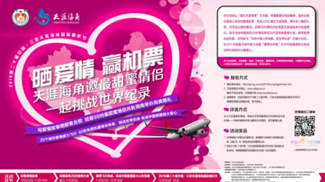 “Honey,永远爱你哦~~””我爱你,爱到天涯海角去呢!””我今天正式向我最爱的女朋友求婚啦!”……相信类似的肉麻情话你一定没有少见。热恋中的情侣合照,互表心意的肉麻情话,在微信、微博、人人、Facebook、推特等社交网络上,随处可见。我们把这类行为统称为“秀恩爱”。恩爱是一种情感,总会给旁人一种两情相悦如胶似漆的感觉。 心理学家分析指出,公开展示恩爱这种行为也是自我形象建构的一部分——至少是有人爱的、受欢迎的、有吸引力的。 所以,适当地晒恩爱非常有必要。 今天你晒恩爱了吗?不如小编告诉你最近很流行的一种新颖的晒恩爱模式吧,你一定会动心! 怎么个新颖法? 近日,由三亚市委宣传部作为指导单位,三亚市旅游委、三亚市文体局主办,三亚市天涯海角旅游发展有限公司、南方卫视《FUN尚荟》、广州飞霖文化传播有限公司承办,广州联纵睿达文化传播有限公司全程策划执行2016第二十届中国·三亚天涯海角国际婚庆节发布了新闻发布会,正式开启了#2016第二十届中国·三亚天涯海角国际婚庆节#挑战世界纪录,共绘中国心的网络征集活动,网络征集活动在微博上一开始,就马上引来了一大批粉丝围观,粉丝们表示城会玩。