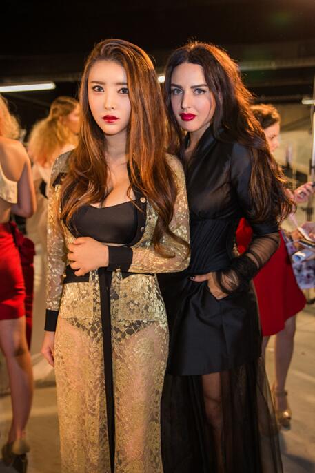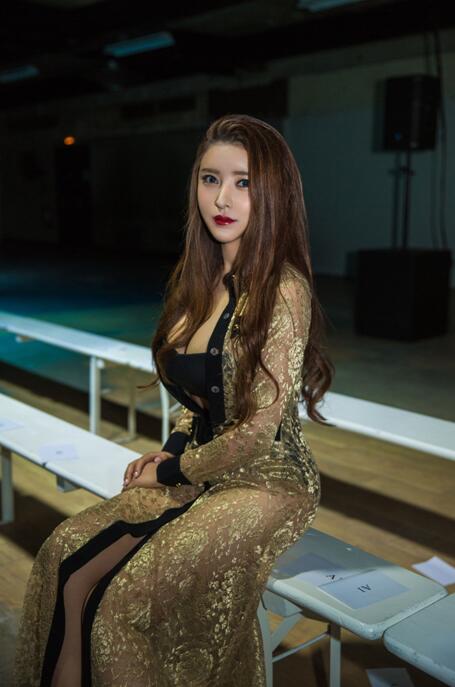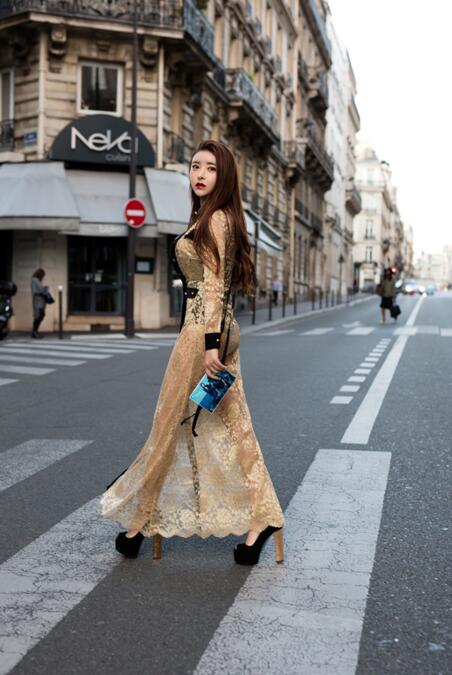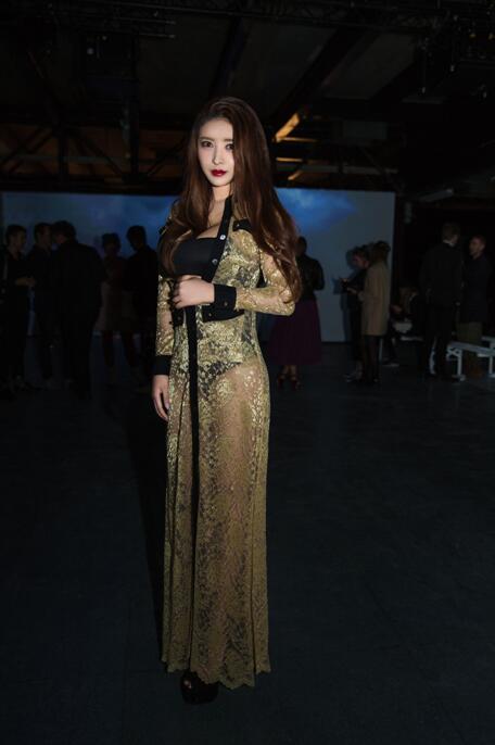 烈焰红唇,浓浓美眼,黑衣裹胸,金纱披衣,冷俊的东方美女,在巴黎绽放光泽。对于此次的金色透视长裙,朴梓善也多次和设计师沟通,无论在款型还是面料上都很好的展现了本次时装秀梦幻、复古的理念。