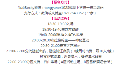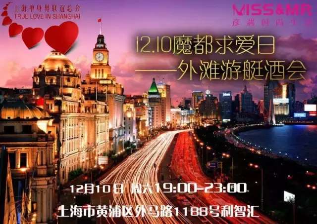 万众瞩目,精英荟萃,佳丽云集。在这里,您可以实现您的“白马王子与白雪公主”的童话爱情故事的完美邂逅,在这里您或许可以找到陪您共度漫漫人生中那个他或她。本年度魔都最强时尚单身游艇酒会,期待与您的幸福相约!年末将至,重要的事情说三遍:单身宝宝们千万不要错过哟~~最后,让我们真心的祝愿本次魔都求爱盛会取得圆满成功!同祝天下有情人终成眷属! |