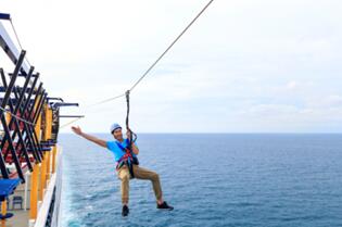 还有什么比在大海上玩水上滑梯更加酷炫的事情? 追求刺激玩乐体验的话,一定不能错过位于「云顶梦号」最高处的水上滑梯乐园,纵横在邮轮上的水上滑梯,犹如神笔马良挥笔即现的彩带,交织在甲板上。园内设有6条老少咸宜的水上滑梯,形状各异、速度不同,其中一段还在船身外、海面上。飞驰在海洋上空,尽享高速滑落带来的极致快感。 海上绳索场 尖叫一次怎么够?18层楼高悬空在海面的滑索道,距长达30米的巨型索道滑索,绝对是你不能错过的体验。离开踏板的瞬间,360度完全置身于海洋上空的感觉令人心跳加速,但却能感受到从未有过的自由。你敢去试试吗?