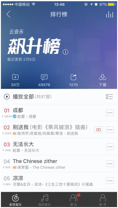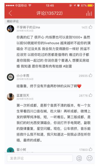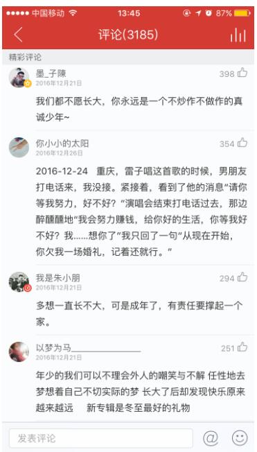 (截止2017年2月6日,网易云音乐上赵雷《无法长大》数字专辑销量破15万张) 其实,这并不是赵雷和《成都》第一次引爆全网。早在2016年10月,赵雷在网易云音乐发布录音室版本《成都》时,这首娓娓道来的暖心民谣就在第一时间俘获了众多乐迷,而雷子纯真质朴的声线,更是牵动了大家的成都情怀。 就像网易云音乐网友@Hauntin所言,“赵雷的歌朴实无华,都是对生活的体会和领悟。都是自己真实的经历,所以给人的感觉真实,能引起共鸣”。上线24小时,《成都》在网易云音乐上的评论数就已突破3万,几乎每一条评论都是一个关于成都、关于青春、关于过往岁月的回忆。同日,《成都》登顶云音乐官方新歌榜和飙升榜首位,那些有故事的乐评也成为文娱媒体和地方媒体新闻素材,足以证明作品的质量。
