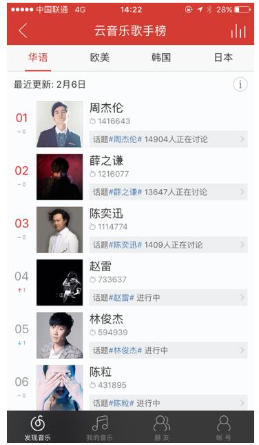 (2017年2月6日网易云音乐飙升榜,赵雷《成都》位居首位) 同时,赵雷的歌手热度也在极速上升中。以较具公信力的网易云音乐歌手榜为例,赵雷已迅速从2016年10月《成都》发布前的十名开外,蹿升至目前的第4位,仅次于头部流行歌手周杰伦、薛之谦和陈奕迅。
