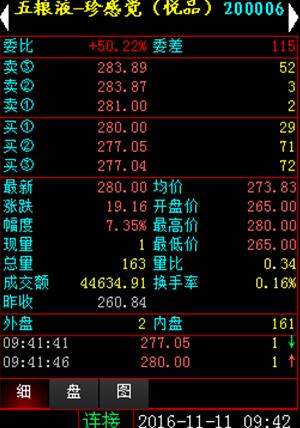 自打开一字板以后,五粮液·珍感觉酒(悦品)交投异常活跃,一根阴线调整之后暴涨9连阳,价格天天创新高。截至11月11日09:42分,最新报价280元,涨幅为7.35%,较发行价上涨260元,价格再创新高。