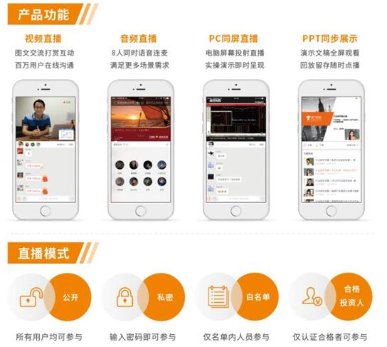 根据证券业协会的数据,截止2016年末,境内有备案的证券分析师2345人,研究员36305人。而A股公司仅3000多家,平均每家上市公司有13位分析师跟踪;截止2016年11月,我国境内共有108家公募基金管理公司,共发行3657只基金。平均每家基金公司有336位分析师服务,每只基金10位分析师服务。 如果说为公募基金提供的研究服务已经供过于求,为万亿个人投资者提供的研究服务却一直停留在近乎空白的阶段。对于普通投资者来说,无论你是跟风操作的“快枪手”,还是喜欢研究思考的价值投资者,多数时候都仅能获取非常基础的常规资讯服务,交易功能之外,甚至是零服务,近距离获取明星分析师的路演也绝无可能。 面对这种情况,研究服务供应商和投资者都在寻找有效的对接途径。从2016年起,逐渐有分析师开始尝试使用网络直播平台来直播观点,比如海通证券煤炭行业分析师李淼、方正证券通信组分析师廖蕾,在美拍APP上的直播可谓一战成名。但随后,由于券商服务合规、平台调性匹配等方面的原因,这种直播研报的模式未能持续。这应该算是分析师直播的1.0时代。