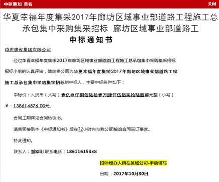 中东集团官方公众号显示,中东建设集团1.38亿元成功中标华夏幸福年度集采2017年廊坊区域事业部道路工程施工总承包项目。 中标通知书原文: ![]() 公开信息显示,本次中标工程范围在廊坊市市域内,施工道路总长度预计不少于9000米,主要包括但不限于生态文化艺术新区、广阳经开区等区域。涵盖道路工程(含主辅路及便道)、排水工程、电力排管、路灯预埋管线、电缆穿线、手孔井砌筑、路灯基础、交通设施工程预埋管线等。 资料显示,中东建设集团不断承接重大项目的建设,在基础设施领域取得了良好成绩,得到了广大客户的一致认可和肯定。集团将继续坚持“以质量求生存、以管理求效益、以信誉求发展”的经营发展方针,严把工程质量、竭力以高品质、高效率保证项目顺利完成。 |