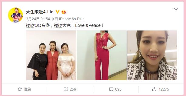 盛典过后,连续两年出现的A-Lin更通过微博表示了对盛典主办方QQ音乐的感谢。