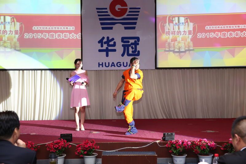 在年会上,华冠商业别出心裁的请来了机器人、无人机助兴。首先,用无人机为各部门优秀经理和员工发授锦旗,以先进的高科技和丰富的想象力完美融合赢得了全体员工的满堂喝彩;之后,华冠商业各部门分别献上了精彩表演,尤其是便利店事业部的三句半“鼠”来宝,更是引起了阵阵哄笑。
