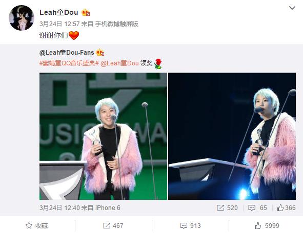 以“天之骄女”身份进军乐坛的窦靖童,骨子里父母留下的音乐天赋和个性基因成就了她独特的音乐世界。当被问及人生的第一个奖杯是否会交给爸妈时,窦靖童表示奖杯还是要留给自己,但会打电话炫耀一下。在后台,窦靖童也表示新专辑即将完成,里面包括从16岁开始写的歌。盛典结束后,窦靖童也转发了歌迷会的微博表达了对粉丝和盛典的感谢。