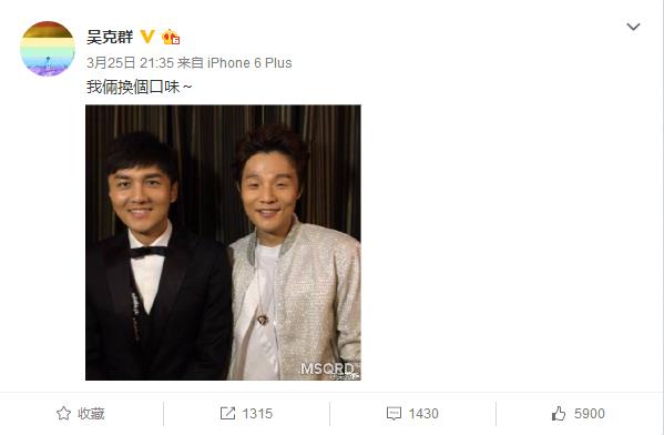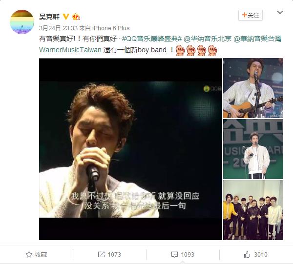 盛典结束后,吴克群还在微博上表达了对乐队以及QQ音乐的感谢。