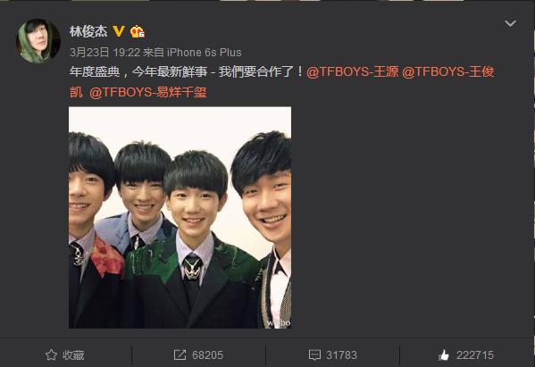 在盛典接近尾声时,更有细心的歌迷捕捉到了温馨一幕:在领奖后,林俊杰看完了整场演出,诚意十足,获无数粉丝点赞。 当晚,林俊杰也发布微博表示即将与超人气少年天团TFBOYS合作。