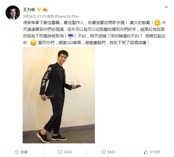 盛典结束后,王力宏也在第一时间发布微博表达对QQ音乐的感谢和粉丝们的支持。