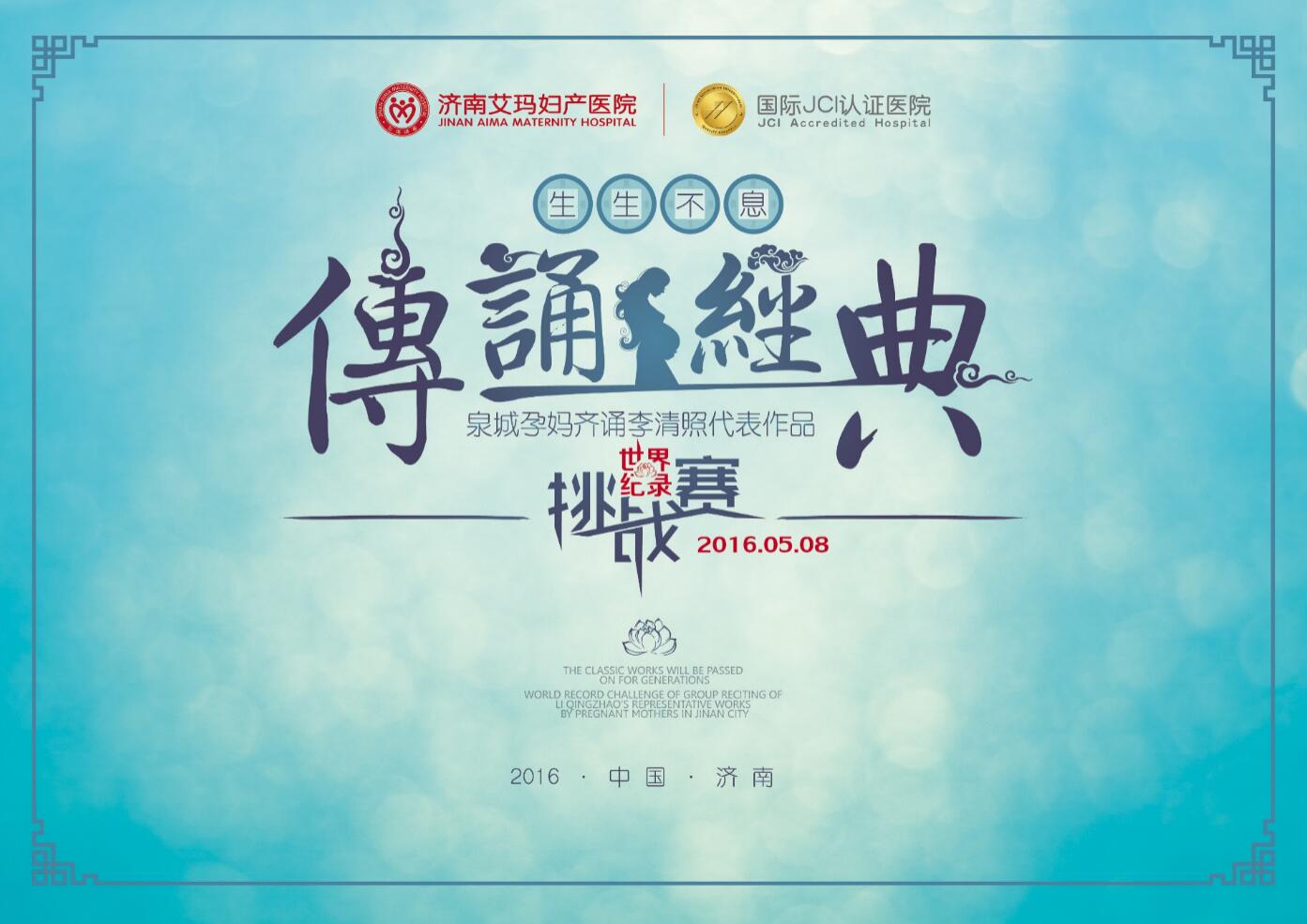 2016年5月8日,济南艾玛妇产医院“生生不息 传诵经典 泉城孕妈齐诵李清照代表作品世界纪录挑战赛”,将在济南大明湖畔打响,如果挑战成功又将创造一项属于济南人的世界纪录。目前,活动已经进入倒计时阶段,孕妈妈报名即可参加,一起来挑战和创造济南人的新纪录。