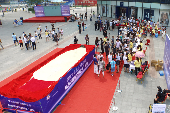 2015年7月25日上午,济南众多市民齐聚百步亭中国MALL售楼中心,创造了“世界最多人共同启幕售楼中心”的世界纪录。此次活动,政府领导及社会各界人士莅临现场,参与盛典,共同见证了世界记录的诞生!本次活动已被现场认证,为因售楼中心开放人数而创世界纪录在济南绝对前所未见。