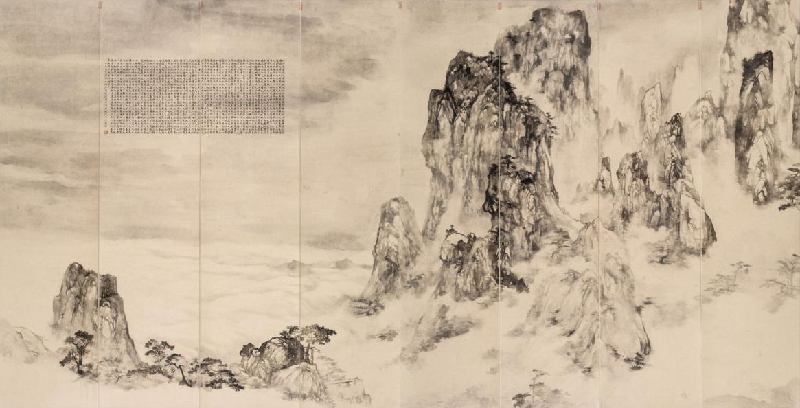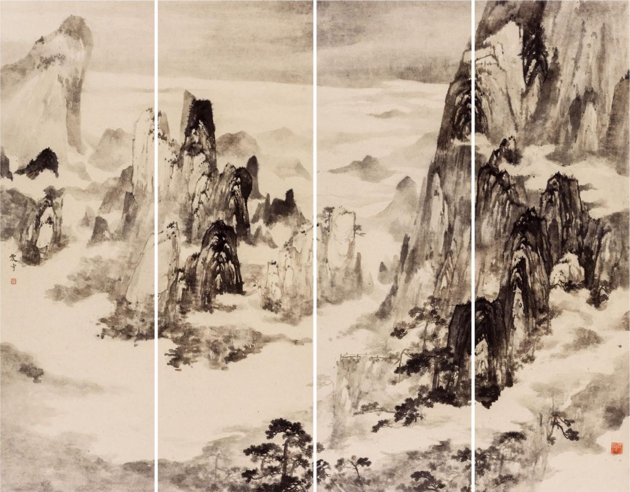 邓震宇《黟山云海》水墨 135x105cm 2015年 据悉,传统的中国画自隋唐有了明确的分科,人物、山水、花鸟画较之前有了长足的发展。山水画以山川等自然景象为主要的描绘对象,是中国传统绘画中一颗耀眼的明珠,山水画不仅促进了中国画走向巅峰,也承载了历朝历代许多文人雅士的志趣情感。文人喜爱用这种独特的笔墨语言抒发心中无限的惆怅和对大好河山的爱恋之情,将心灵深处的情感物化为一种形式,使之成为寄托感情的载体,这些看似平凡无奇的山河湖泊倾注了画家们更为深沉的情感,这便是山水画如此受尊崇的原因之一。近代以来,山水画题材的选择更为广阔,风格样式也更为多变,但仍面临着一个严峻的问题——传承与创新,如何在传承的基础上创新,如何从现实生活出发探求更为新颖的艺术语言,这应该是山水画发展到今天亟待解决的问题。