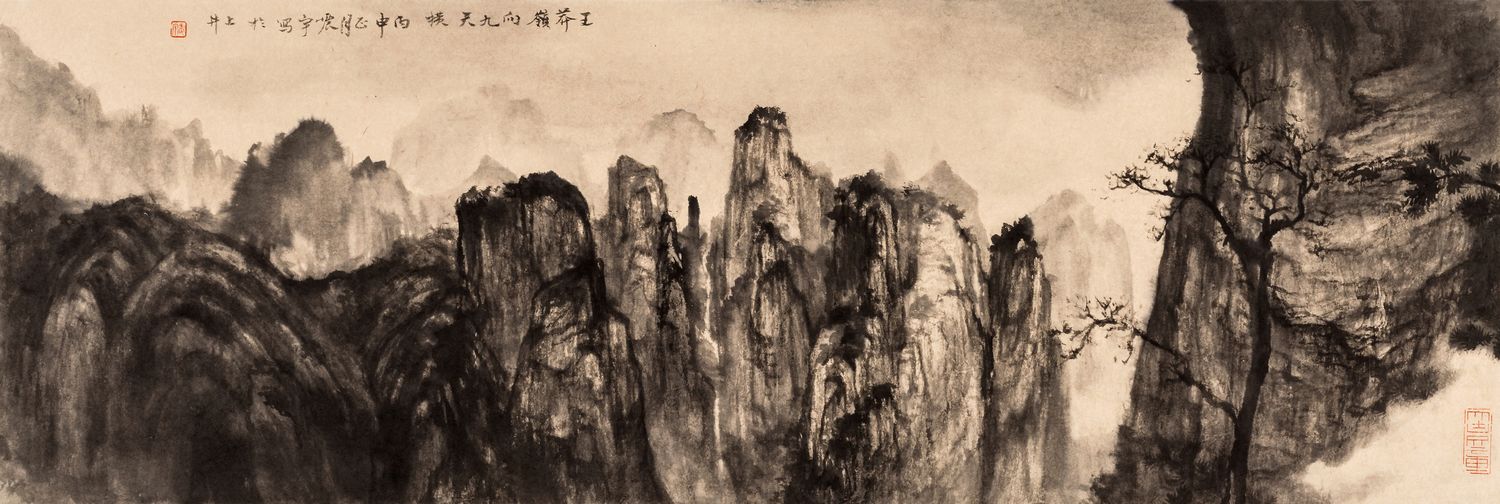 邓震宇出生于1993年,本科就读于中央美术学院国画专业,现居于北京,Artpollo阿波罗签约艺术家。虽然很年轻,但邓震宇的在创作道路上的成绩算得上可圈可点,他曾以命题作业满分进入美院,经过更为专业的训练,绘画水准得到大幅度提高,并多次获奖参展。 王履在他的《华山图序》提出了一个极其重要的理念:“吾师心,心师目,目师华山”,强调了山水画创作中师法自然的重要性,这与唐人张璪“外师造化,中得心源”的个人实践体验有异曲同工之妙,邓震宇的山水画写生就是这的真实写照。邓震宇的对景写生,注重通过自身的主观情绪再加上大自然所呈现出来的景色,对其进行创作。他的写生不仅限于南方山水(黄山),另外对于北方山水(太行山)也寄情其中。对于太行山的写生,他进行了细致入微的观察。王莽岭、龙水轩都是作者笔下的山水素材。《王莽岭向九天横》邓震宇以俯视和平视的姿态在视觉范围内来选取写生的角度,他以用干笔皴擦出山的轮廓,结合湿笔晕染,我们可以清晰看到湿笔晕出的山体之势,干湿结合使得整幅画面融为一体。《源远》、《流长》两幅画将三远表现的比较鲜明,淡墨为主,一改浓墨晕染之态。